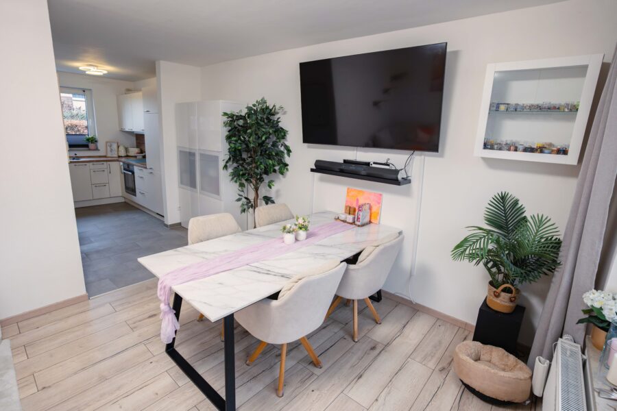 Im Erdgeschoss schaffen die offene Küche, das helle Wohnzimmer mit neu verlegtem Laminat sowie die neu gefliesten Bereiche in Küche, Flur und im Gäste-WC ein stimmiges und gepflegtes Gesamtbild. Im Wohnbereich besteht zusätzlich die Möglichkeit, einen Kamin einzubauen – für noch mehr Gemütlichkeit.