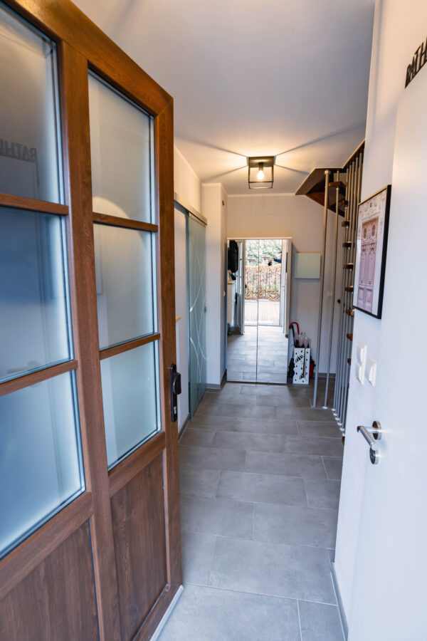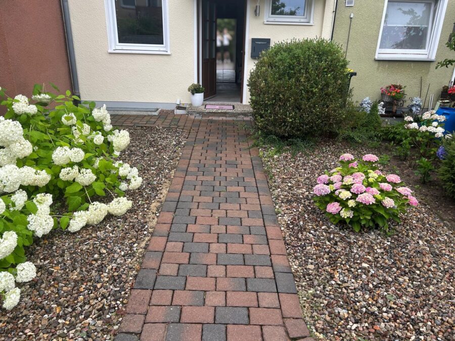Der Vorgarten wurde liebevoll neu angelegt und besticht durch seine pflegeleichte Gestaltung. Blühende Hortensien setzen meist über viele Monate hinweg attraktive Farbakzente und schaffen schon beim Betreten des Hauses eine einladende Atmosphäre.