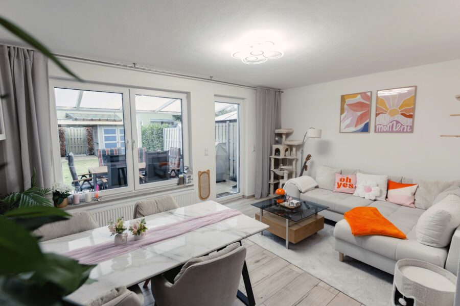 Das rund 165 m² große Grundstück verfügt über eine überdachte Terrasse und einen neu angelegten, vollständig eingezäunten Garten, der sich ideal zum Spielen, Entspannen oder für gesellige Stunden im Freien eignet. Dank der durchdachten Bepflanzung ist der Garten einfach zu pflegen und rundet das ansprechende Gesamtbild der Immobilie perfekt ab. Ein praktisches Gartenhaus bietet Platz für Gartengeräte oder Zweiräder und ist bequem über einen eigenen, abschließbaren Gartenzugang erreichbar.