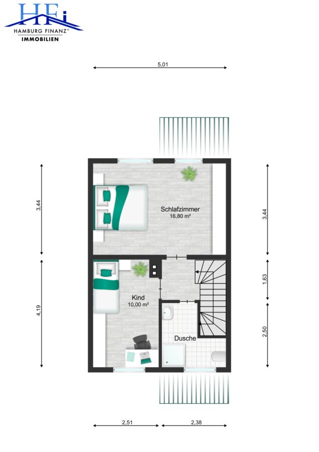 Das Obergeschoss bietet zwei lichtdurchflutete Zimmer ebenfalls neu verlegt mit Laminat und überzeugt durch gerade Wände ohne Dachschrägen, die optimale Stellmöglichkeiten für Möbel bieten. Ergänzt wird diese Ebene durch ein modernisiertes Duschbad mit Fenster sowie einen ebenfalls neu gefliesten Flur.