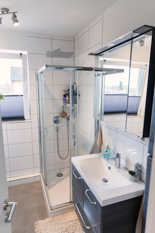 Das Obergeschoss bietet zwei lichtdurchflutete Zimmer ebenfalls neu verlegt mit Laminat und überzeugt durch gerade Wände ohne Dachschrägen, die optimale Stellmöglichkeiten für Möbel bieten. Ergänzt wird diese Ebene durch ein modernisiertes Duschbad mit Fenster sowie einen ebenfalls neu gefliesten Flur.