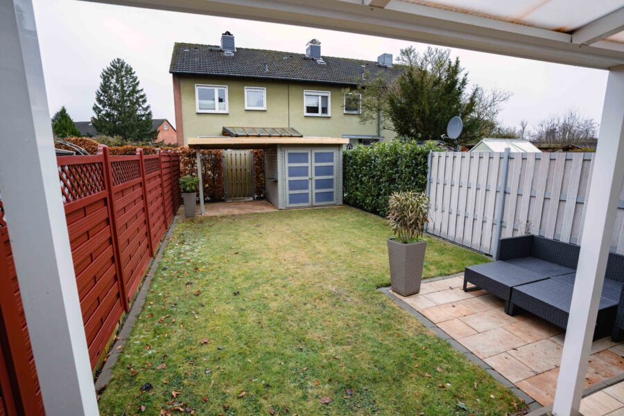 Das rund 165 m² große Grundstück verfügt über eine überdachte Terrasse und einen neu angelegten, vollständig eingezäunten Garten, der sich ideal zum Spielen, Entspannen oder für gesellige Stunden im Freien eignet. Dank der durchdachten Bepflanzung ist der Garten einfach zu pflegen und rundet das ansprechende Gesamtbild der Immobilie perfekt ab. Ein praktisches Gartenhaus bietet Platz für Gartengeräte oder Zweiräder und ist bequem über einen eigenen, abschließbaren Gartenzugang erreichbar.