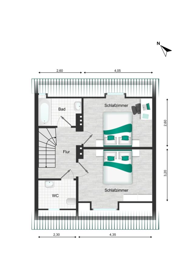 Das Obergeschoss verfügt über zwei Schlafzimmer und zwei Badräume. Ein Raum ist mit der schönen Badewanne ausgestattet. Im zweiten Badraum stehen Ihnen ein WC und ein Waschbecken zur Verfügung.