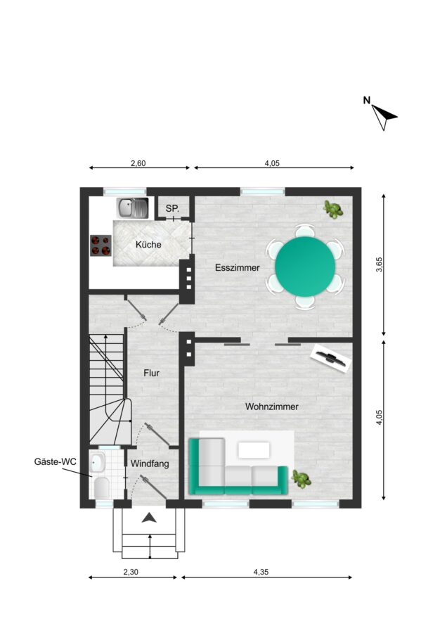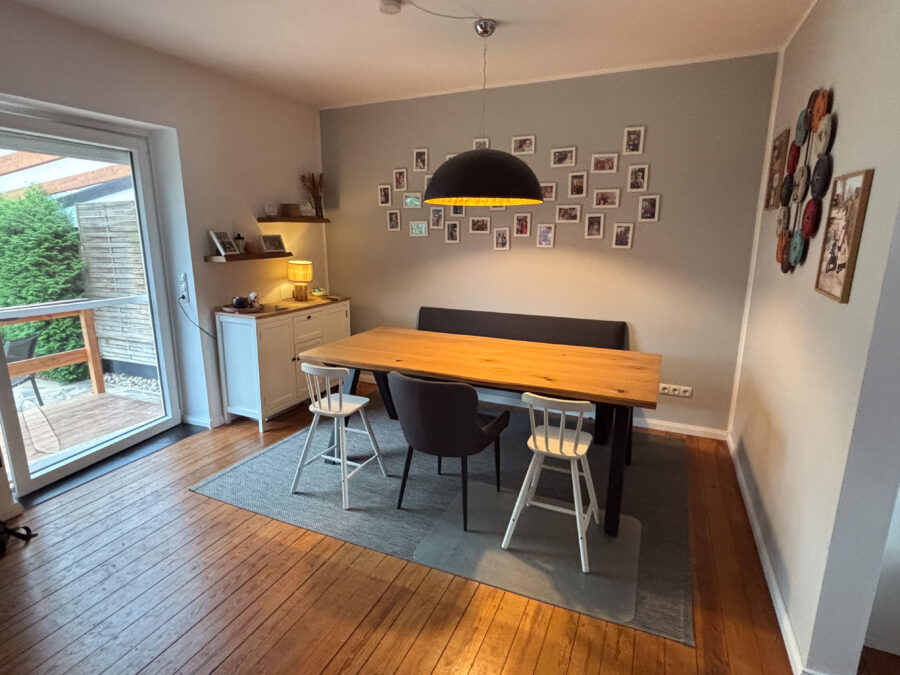 Die Immobilie bietet im Erdgeschoss eine Einbauküche aus 2023 mit hochwertigen Elektrogeräten der Firma Bosch. Direkt angeschlossen ist der Essbereich. Durch eine Glasschiebetür betreten Sie das Wohnzimmer direkt nebenan. Im Wohnzimmer gibt es einen Anschluss für einen Ofen / Kamin. Ein Gäste-WC ist direkt neben der Eingangstür platziert.